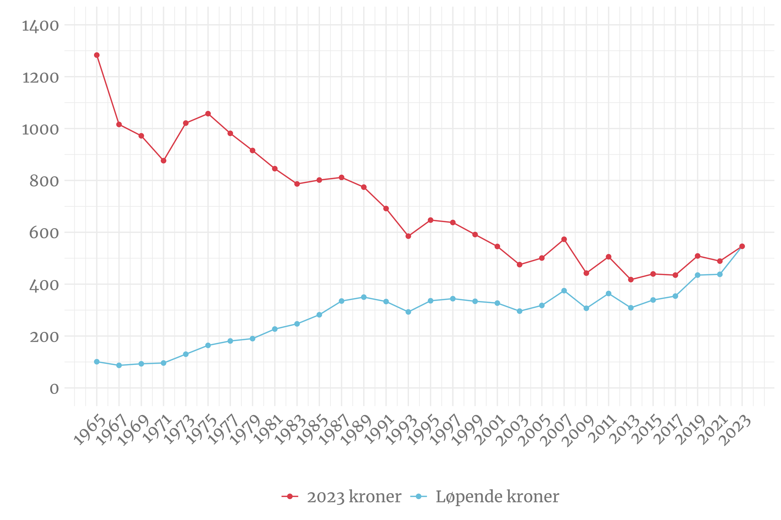 Gjennomsnittlig tømmerpris per kubikkmeter i perioden 1965–2023. Alle tall i kroner. Kilde: SSBs skogavvirkningsstatistikk.