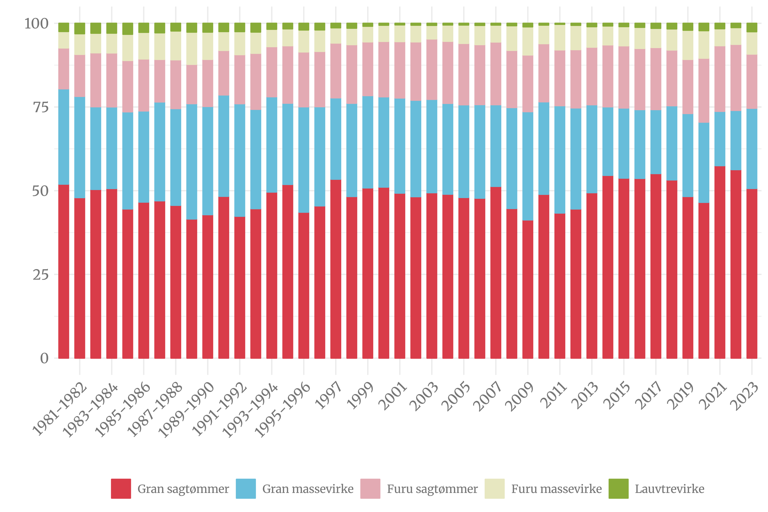 Prosentandel av førstehåndsverdien av industrivirke for salg i perioden 1980/1981–2023 fordelt etter hovedsortiment. Kilde: SSBs skogavvirkningsstatistikk.