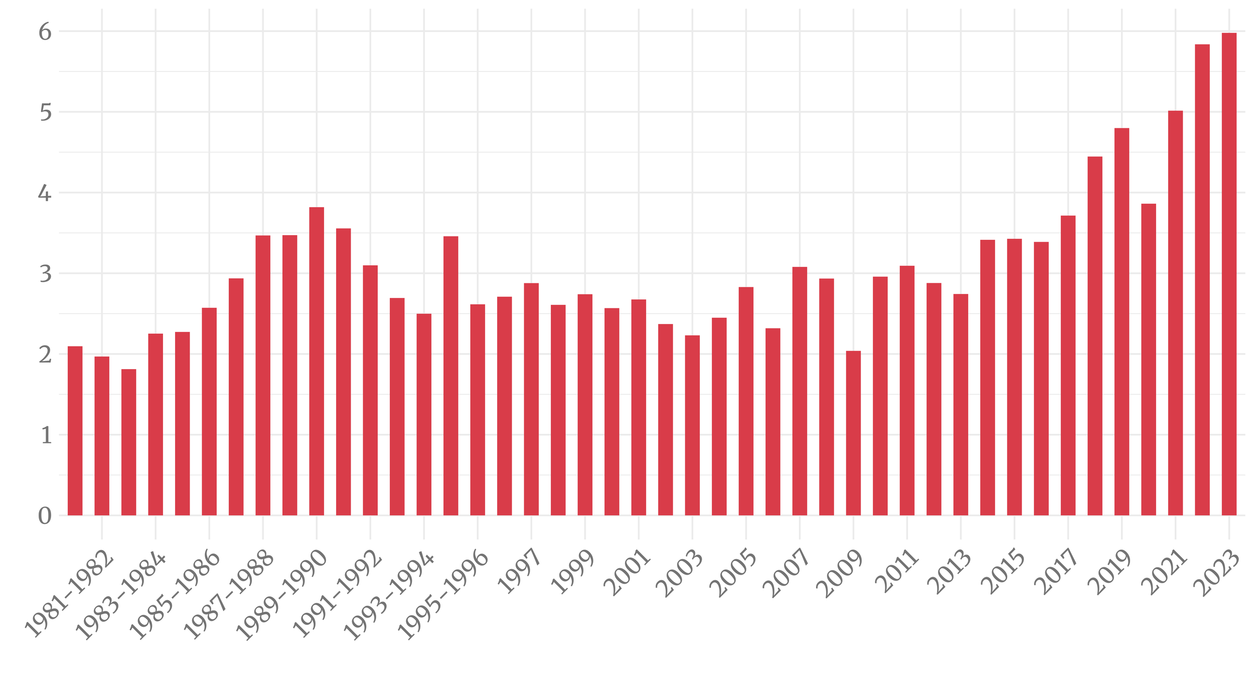 Førstehåndsverdi av industrivirke for salg i 1980/1981–2023. Alle tall i milliarder kroner. Kilde: SSBs skogavvirkningsstatistikk.