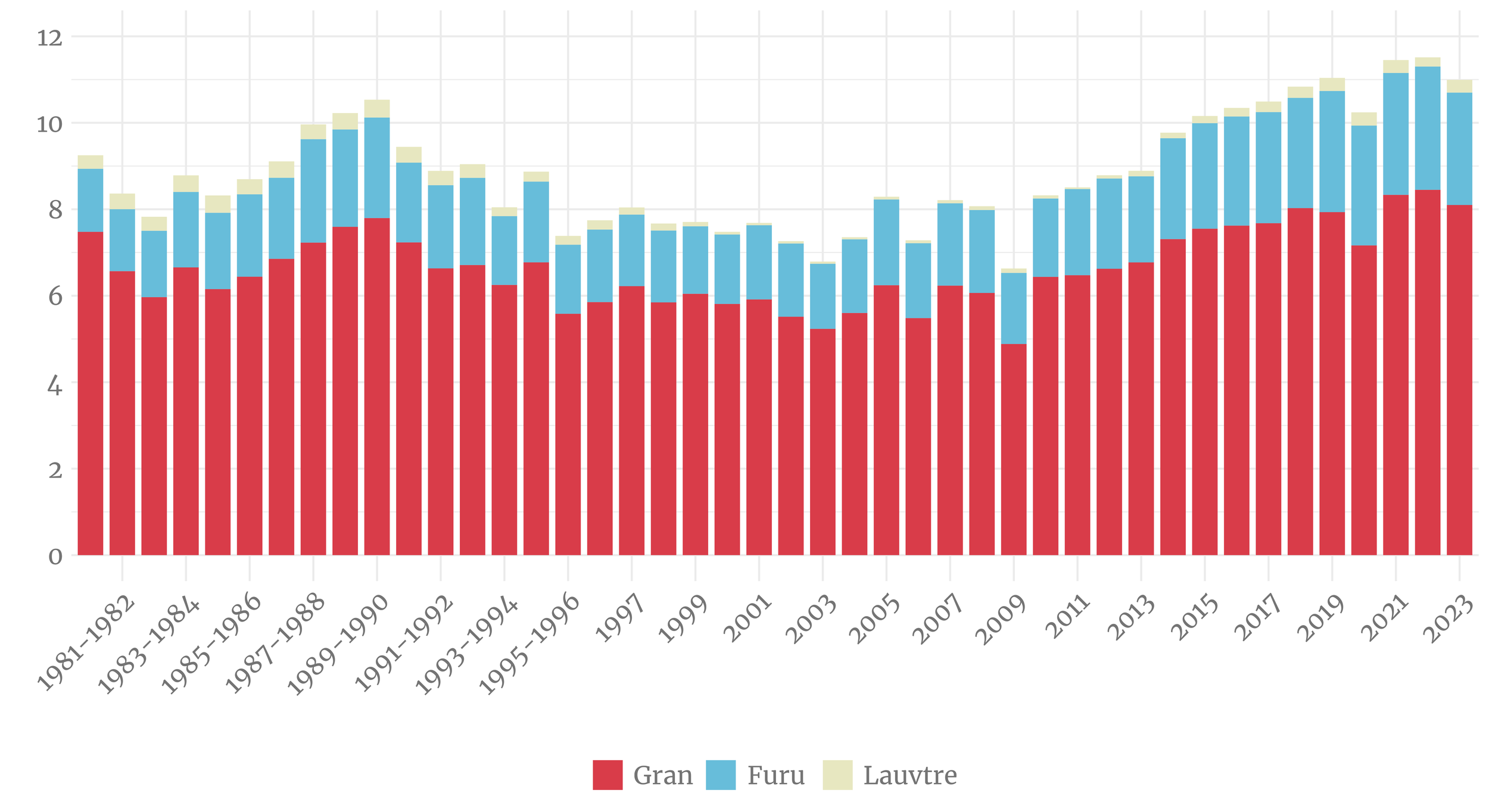 I 1980 utgjorde andelen gran 81 prosent, furu 16 prosent, og lauvtre 3 prosent (Figur 1). I 2023 utgjorde andelen gran 74 prosent av total avvirkning, furu 24 prosent og lauvtre knapt 3 prosent.