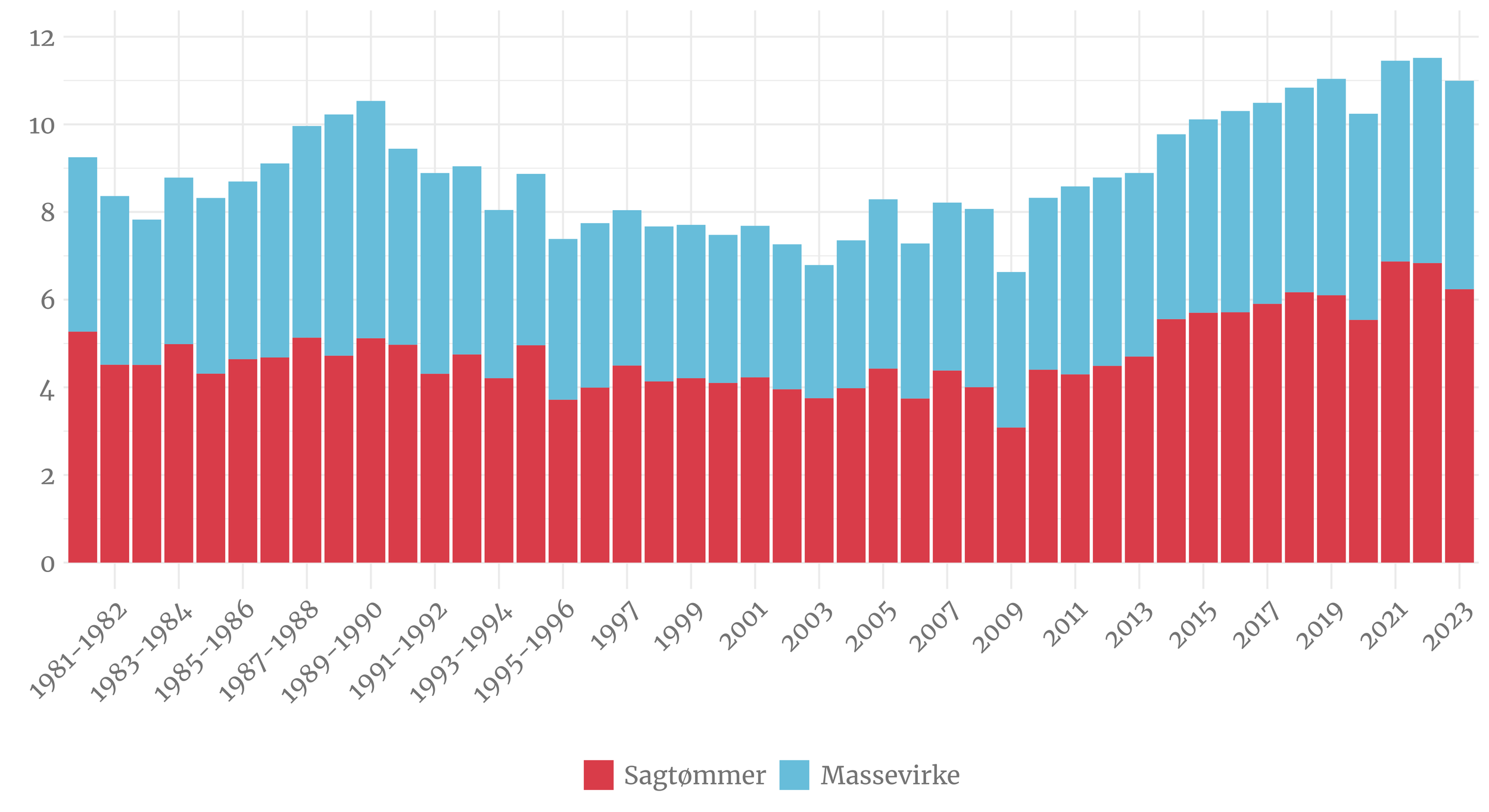 Avvirkning av industrivirke (massevirke og sagtømmer), for salg i perioden 1980/81–2023, fordelt etter hovedsortiment. Alle tall oppgitt som kubikkmeter under bark. Kilde: SSBs skogavvirkningsstatistikk.
