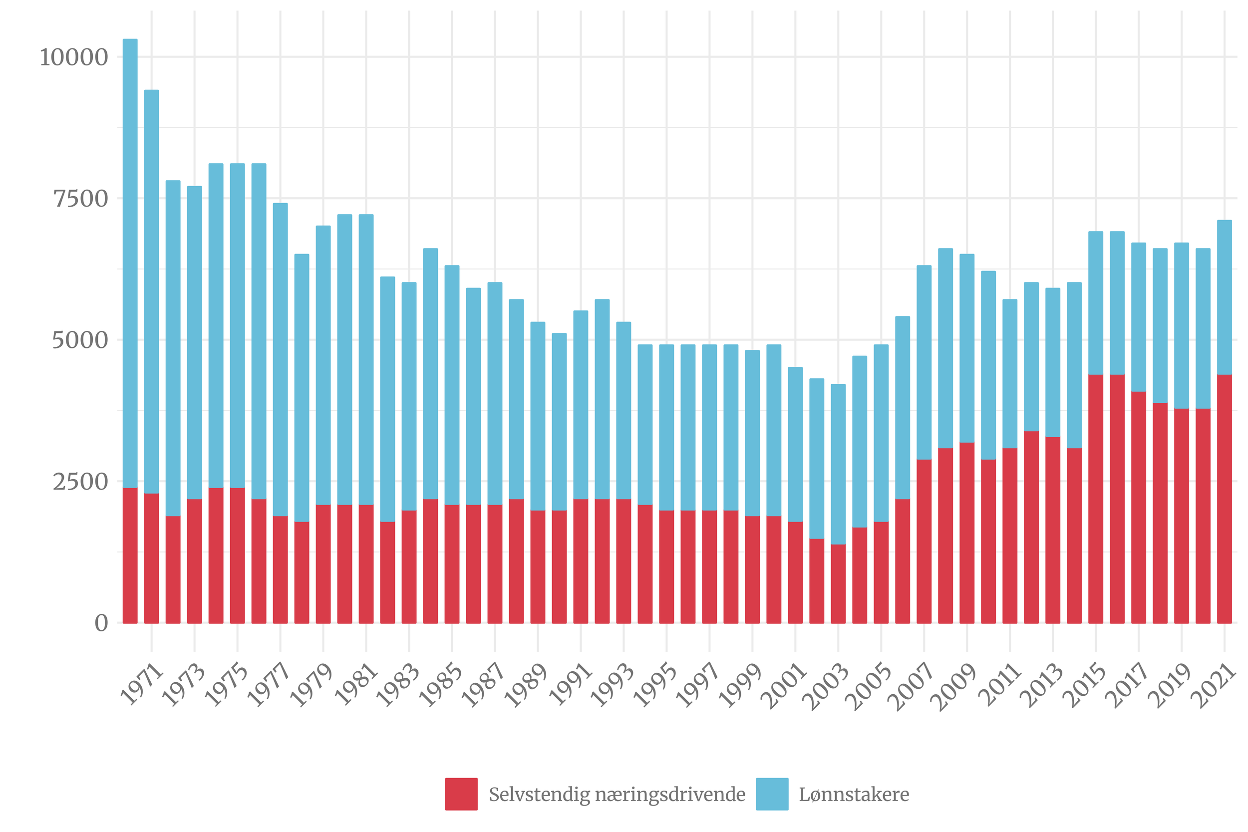 Utviklingen i antall selvstendig næringsdrivende og lønnstakere i skogbruket i perioden 1970–2021. Kilde: Nasjonalregnskapet, Statistisk sentralbyrå.