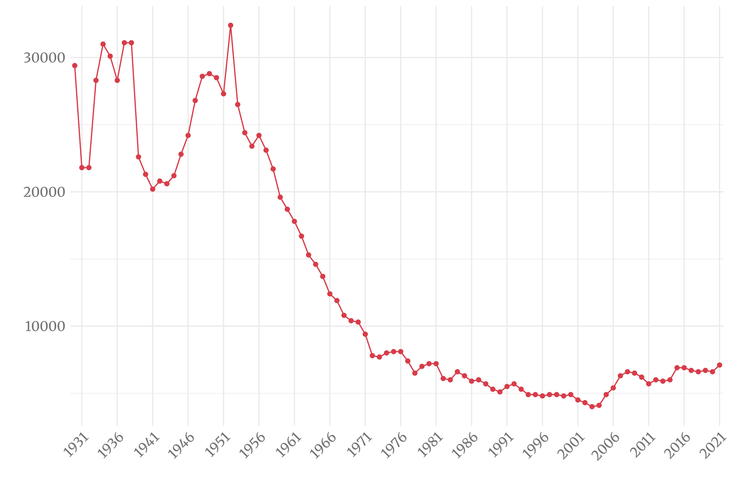 Utviklingen i sysselsettingen i skogbruket i perioden 1930–2021. Kilde: Nasjonalregnskapet, Statistisk sentralbyrå.