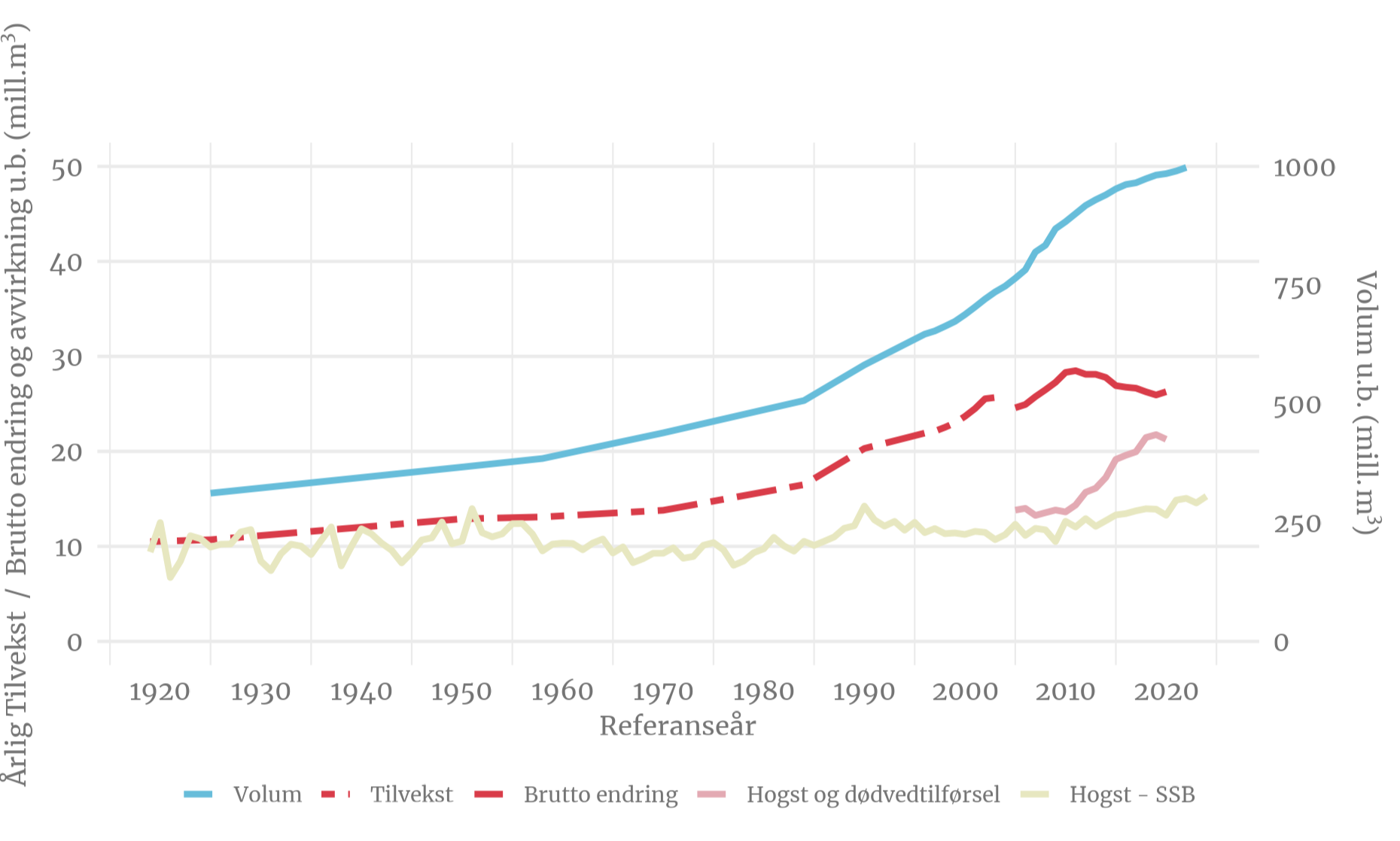 Tilveksten har over lang tid vært høyere enn avvirkningen, noe som har ført til en tredobling av stående volum siden etableringen av Landsskogtakseringen i 1919 (Figur 2). Derimot har den økte avvirkningen i kombinasjon med en økning av dødvedtilførsel (herunder både naturlig mortalitet og gjenværende volum etter eksempelvis tynning og ungskogpleie) ført til en redusert nettoøkning og dermed har volumet begynt å flate ut.